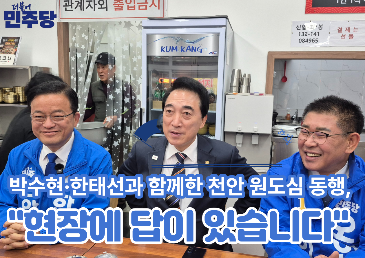 지난 24일, 충남의 새로운 미래를 설계하는 박수현 도지사 후보, 그리고 천안의 발전을 책임질 한태선 시장 예비후보와 함께 천안 원도심의 숨결을 직접 느끼고 왔습니다. 이번 행보는 단순한 방문을 넘어, 도정과 시정이 하나로 맞물려 돌아가는 '정책 연계'의 현장을 시민들께 직접 보고드리는 소중한 시간이었습니다.