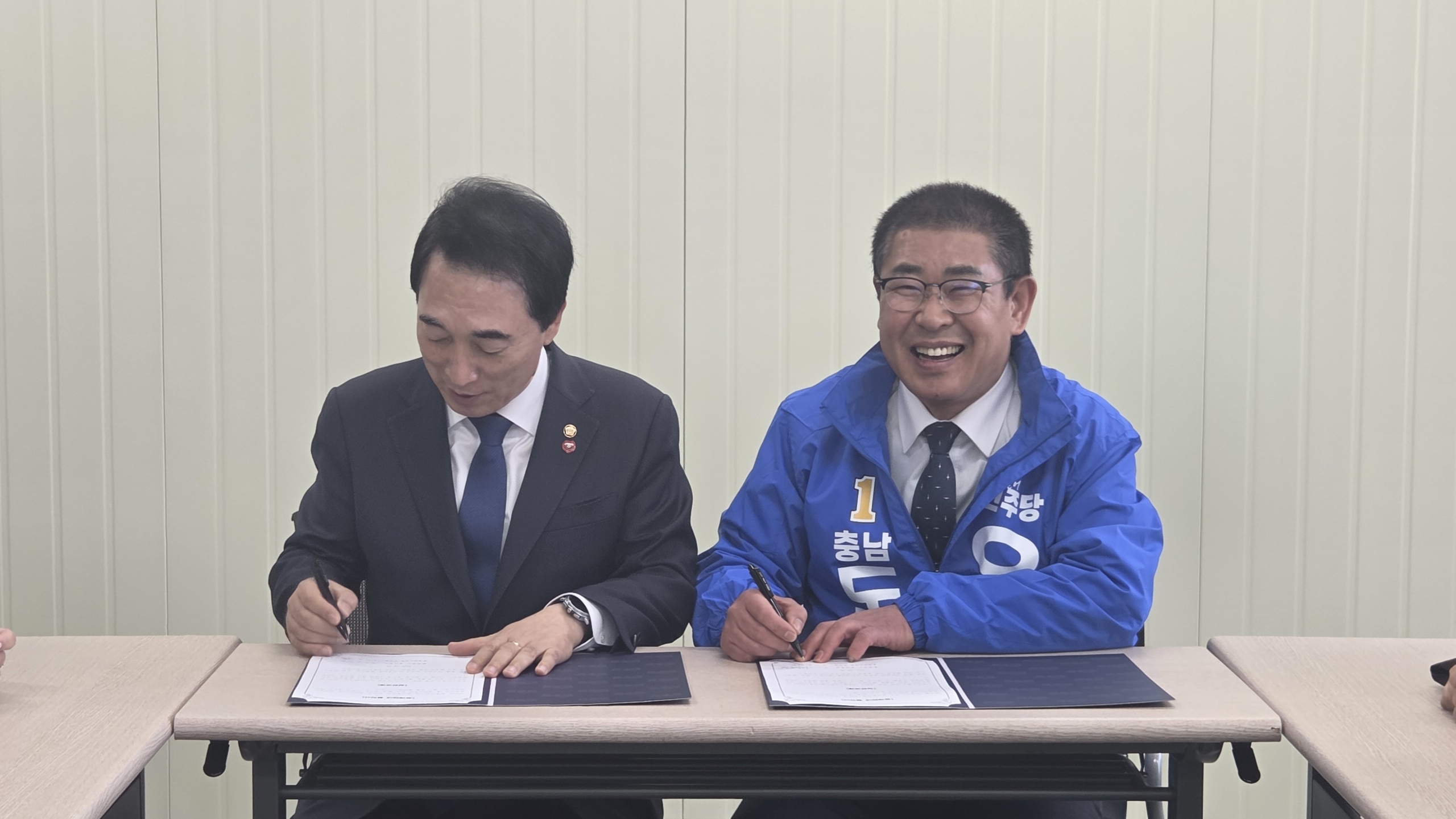 박수현 충남도지사 예비후보와 정책협약 중인 오인철 충남도의회 부의장